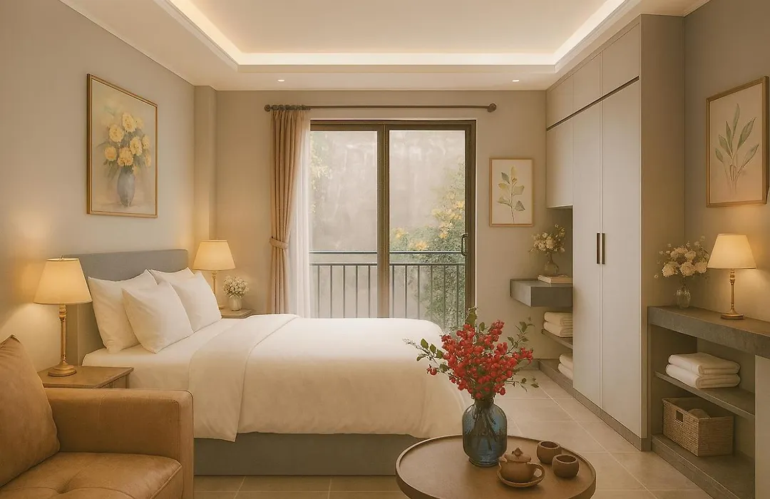 ハノイ市にあるホテルの13室の客室に化粧室、小型冷蔵庫 と防音窓が備わります。
